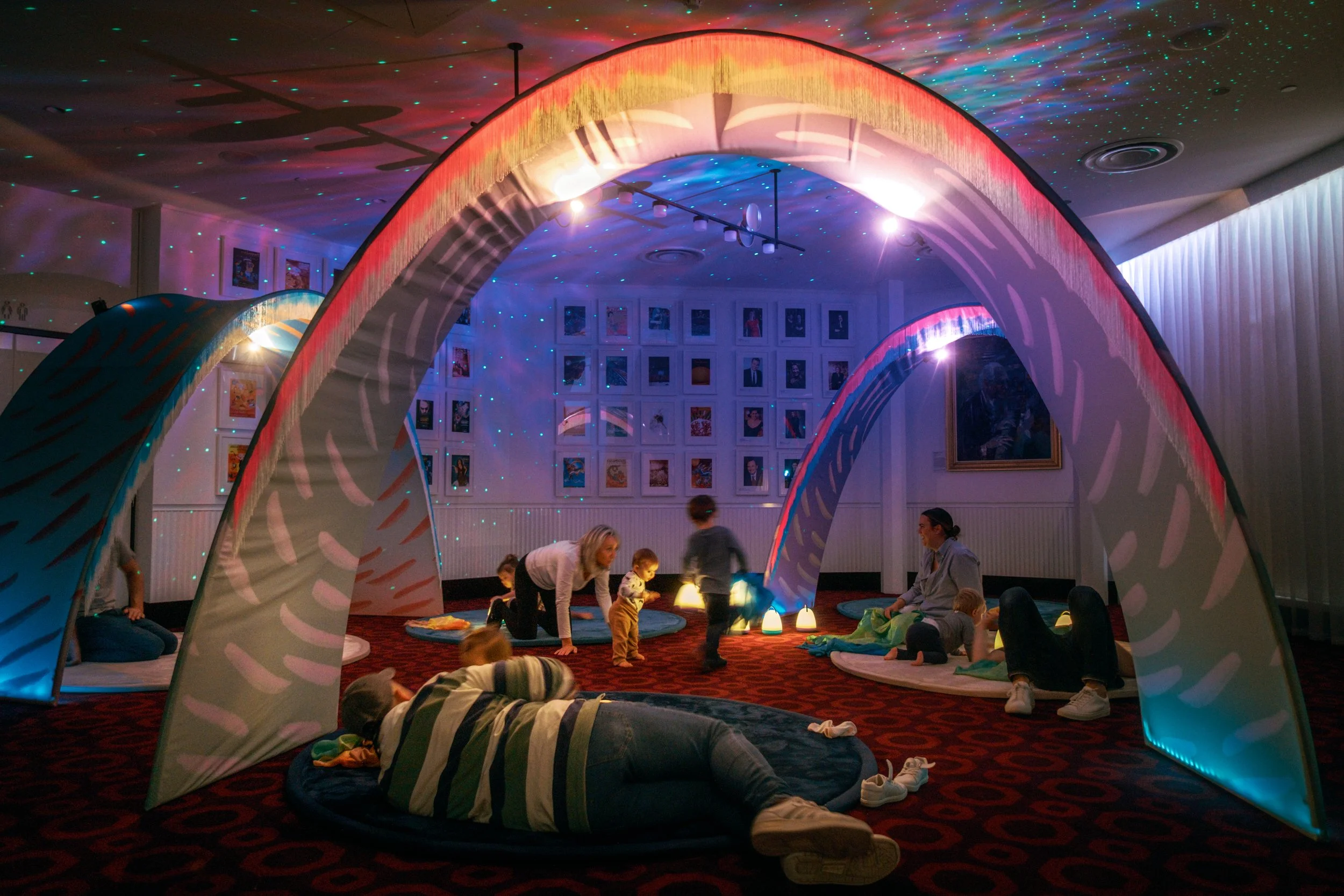 With mellow lighting, subdued colours, and chilled rhythms, this gentle, immersive experience encourages families to ebb and flow together, finding their shared rhythm through movement and gesture.