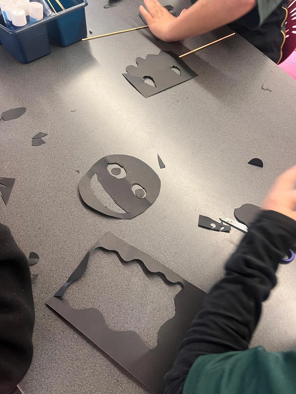 This week some of the students were lucky enough to create simple shadow puppets with Visual Artist, Youbi Lee. As well as playing with positive and negative space, they explored perspective and created simple scenes between their characters.